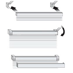 Begin by removing the plastic end caps from the headrail, then slide the blind into the brackets. Make sure that the cords and the side with the pelmet clips are facing outward into the room. Confirm that the headrail is securely seated in the brackets